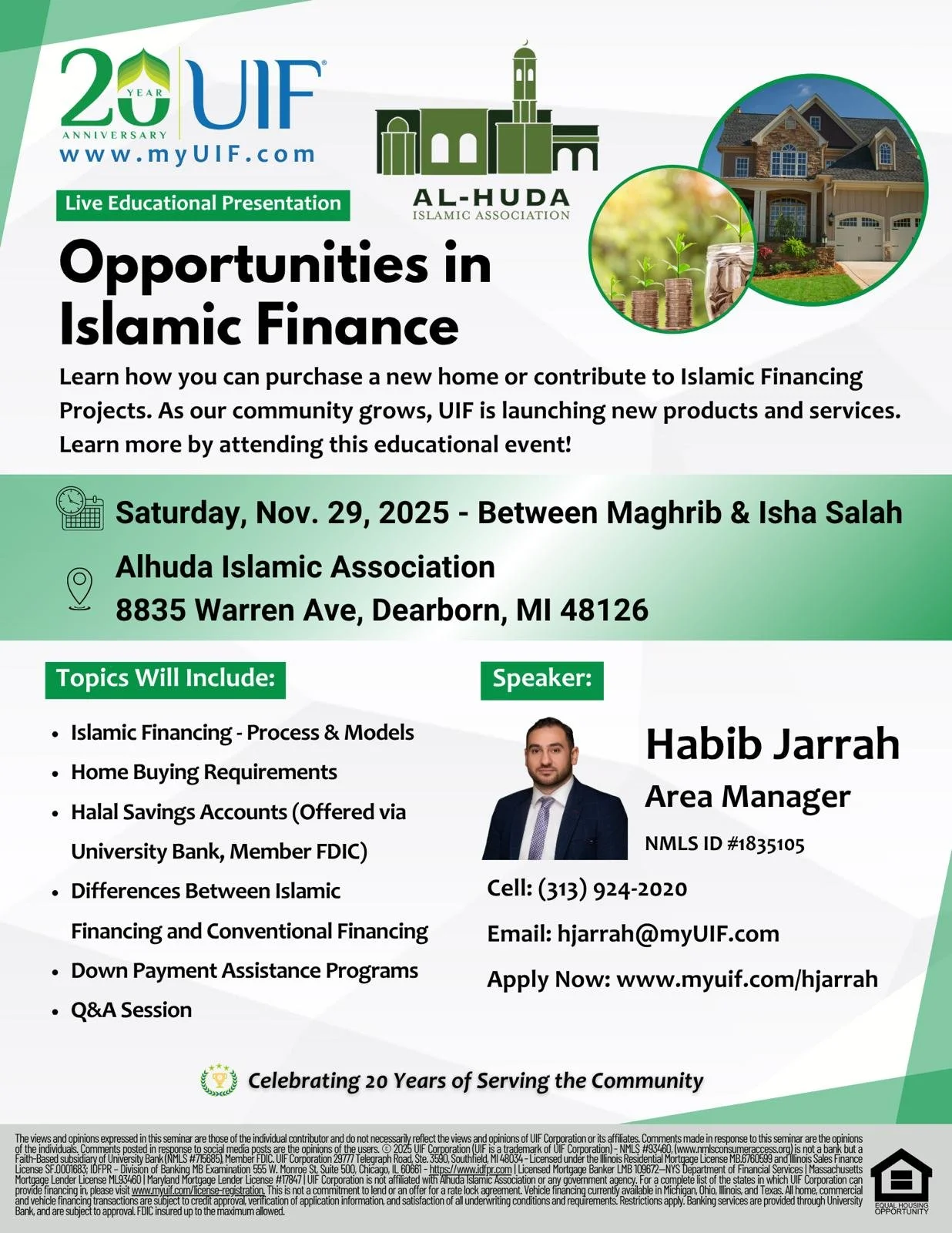 Speaker Habib Jarrah, Area Manager for UIF, will discuss essential topics including the Islamic financing process and models, home buying requirements, Halal savings accounts (offered via University Bank, Member FDIC), differences between Islamic and conventional financing, and down payment assistance programs.